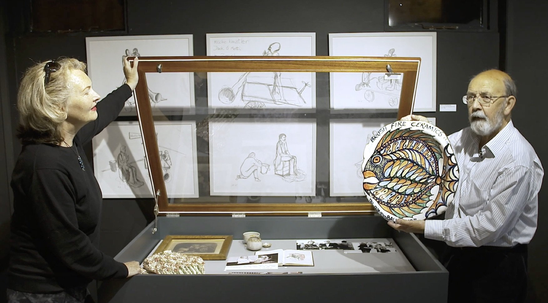 Brian Lalor is the curator of the Ballydehob Arts Museum craft collection. Here in conversation with Angela Brady viewing the well known "Brushfire Fishplate" designed by Noelle and John Verling for their studio and shop at Brushfire, Gurteenakilla, Ballydehob West Cork in 1980's and 1990's.